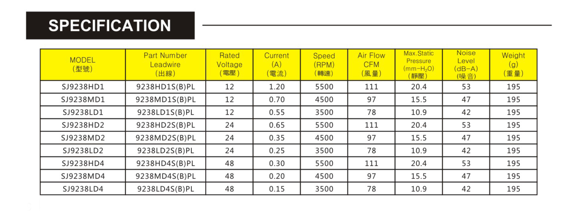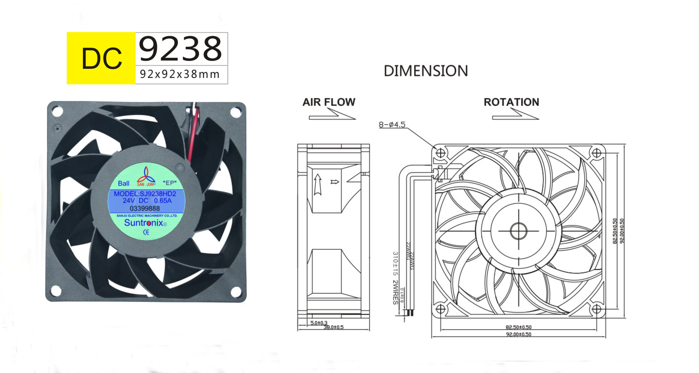 尺寸:92x92x38mm 框架: UL94V-0 PBT 軸承: 含油軸承& 雙滾珠軸承 電壓:DC 5V 12V 24V 48V 壽命:50 000Hours at 25℃--滾珠軸承 30 000Hours at 25℃--含油軸承 工作溫度:-10℃~70℃ 正常濕度 儲存溫度:-40℃~70℃ 正常濕度