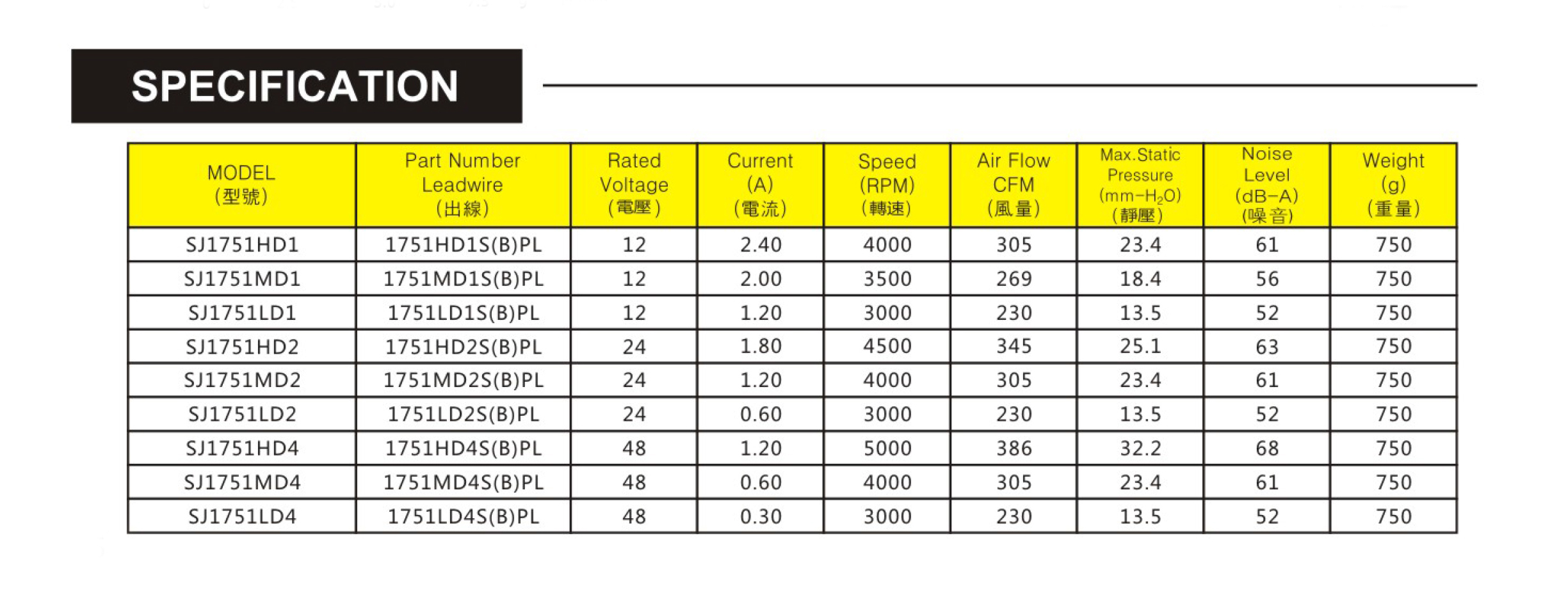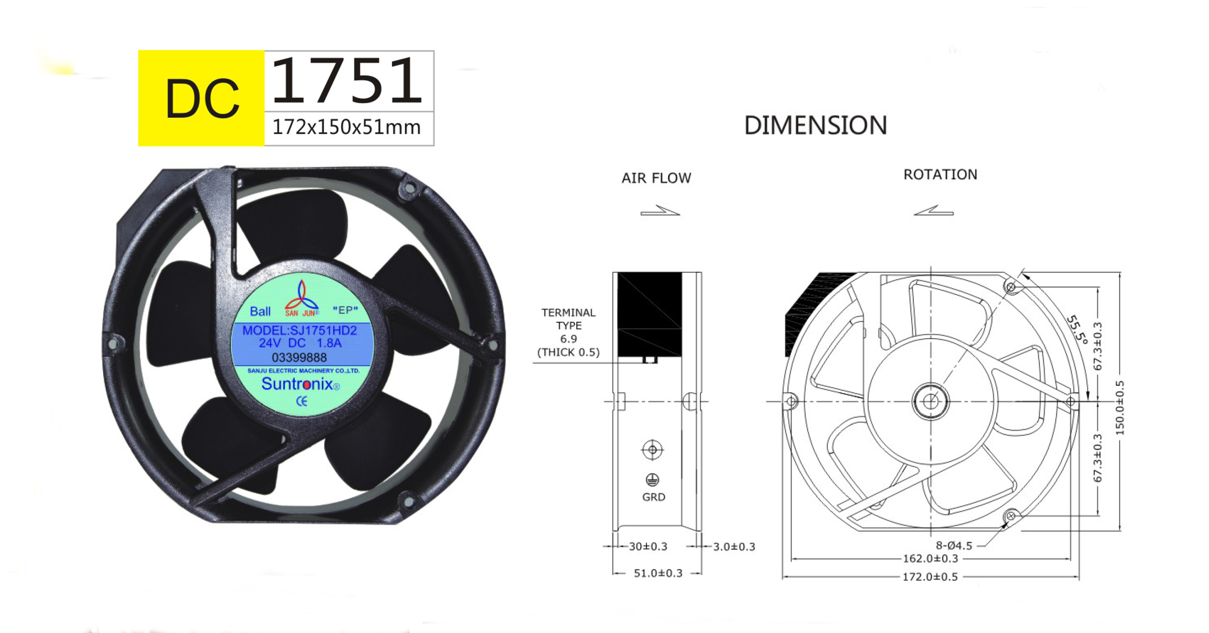 尺寸:172x150x51mm 框架: UL94V-0 PBT 軸承: 含油軸承& 雙滾珠軸承 電壓:DC 5V 12V 24V 48V 壽命:50 000Hours at 25℃--滾珠軸承 30 000Hours at 25℃--含油軸承 工作溫度:-10℃~70℃ 正常濕度 儲存溫度:-40℃~70℃ 正常濕度