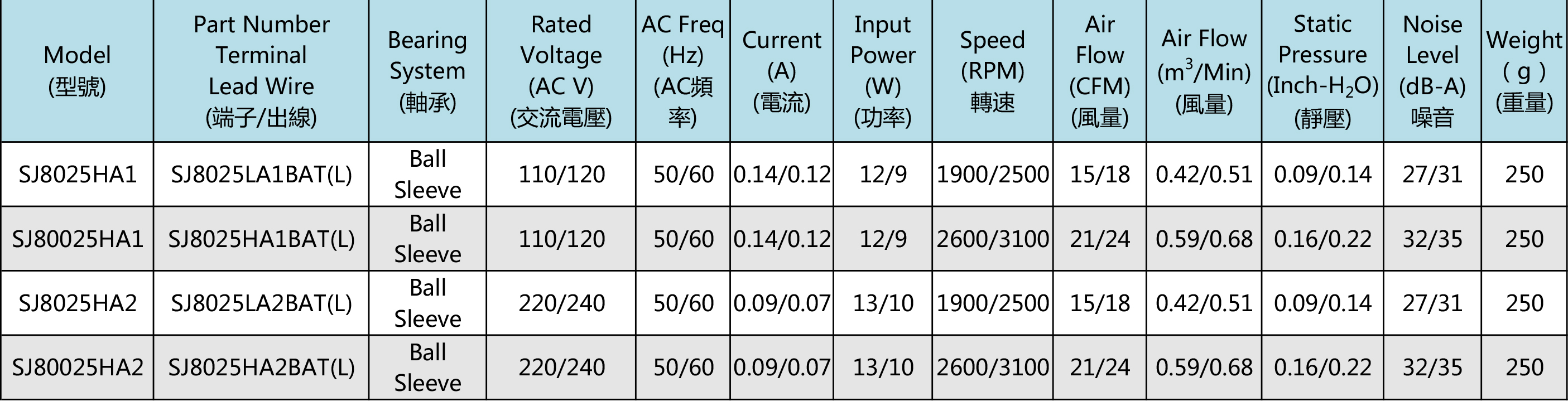 尺寸:80x80x25mm 框架:鋁ADC-12 軸承:含油軸承& 雙滾珠軸承 電壓:AC 110V 220V 380V 壽命:60 000Hours at 20℃--滾珠軸承 30 000Hours at 20℃--含油軸承 工作溫度:-20℃~70℃ 正常濕度 儲存溫度:-20℃~85℃ 正常濕度