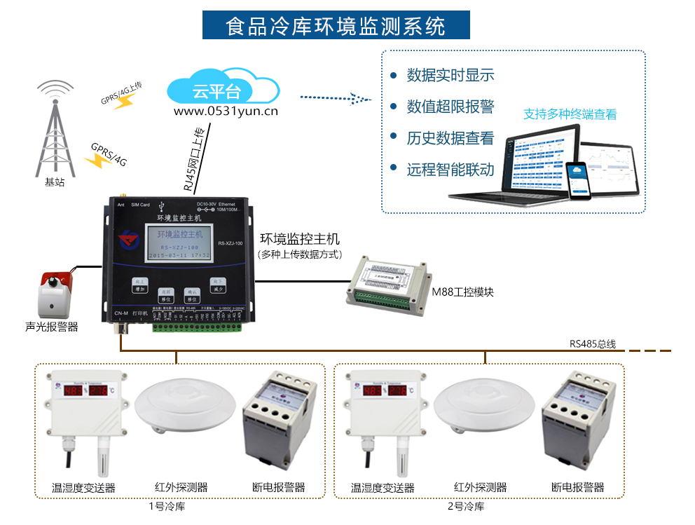 5. 環境監控主機:數據采集并上傳至環境監測平臺,支持RS485、以太網、GPRS等多種數據傳輸方式。同時具有斷電數據儲存,供電恢復后,數據上傳的功能。
