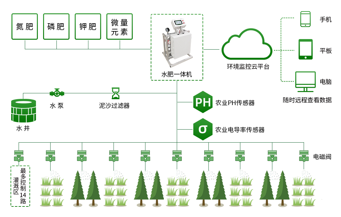 智能水肥一體化系統(tǒng):與傳統(tǒng)的灌溉方法相比,仁科水肥一體化智能灌溉系統(tǒng)采用傳感器、物聯(lián)網(wǎng)、云計(jì)算等多項(xiàng)技術(shù),集灌溉和施肥于一體,由水肥一體機(jī)、土壤墑情采集終端(土壤溫度水分電導(dǎo)率三合一變送器、土壤氮磷鉀變送器、土壤PH變送器)、過濾系統(tǒng)、閥門控制器、電磁閥、田間管路、監(jiān)控軟件云平臺(tái)組成,具有節(jié)水節(jié)肥、節(jié)省人力的特點(diǎn)。